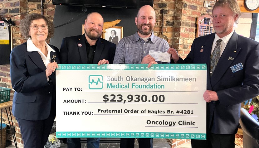 Pictured from left to right: Eagles Members, Roselie Schmidt – Madame President, Harley Elasoff -Past President, Todd Ianone, President and SOS Medical Foundation CEO, Ian Lindsay.